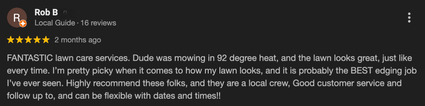 We’re also licensed and insured, giving you peace of mind while we care for your home. Choosing a small business like ours isn’t just about supporting local — it’s about getting a team that truly cares, knows your yard, and treats you like family, not a number.